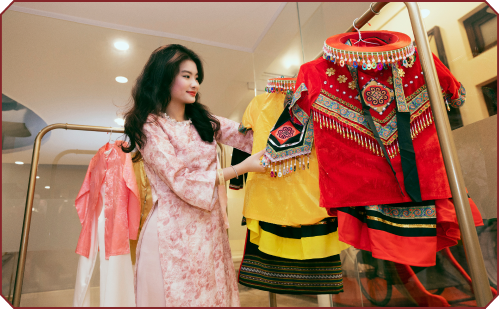 Khoác lên những lớp áo di sản: hoá thân thành hoàng hậu trong tà áo Nhật Bình cung đình Huế, oai phong như bậc quan lại với áo dài khăn đóng truyền thống, tạo nét duyên dáng của áo ngũ thân Bắc Bộ, hay cá tính độc đáo với trang phục dân tộc Tây Bắc, kèm vô số các phụ kiện, trang sức ấn tượng
