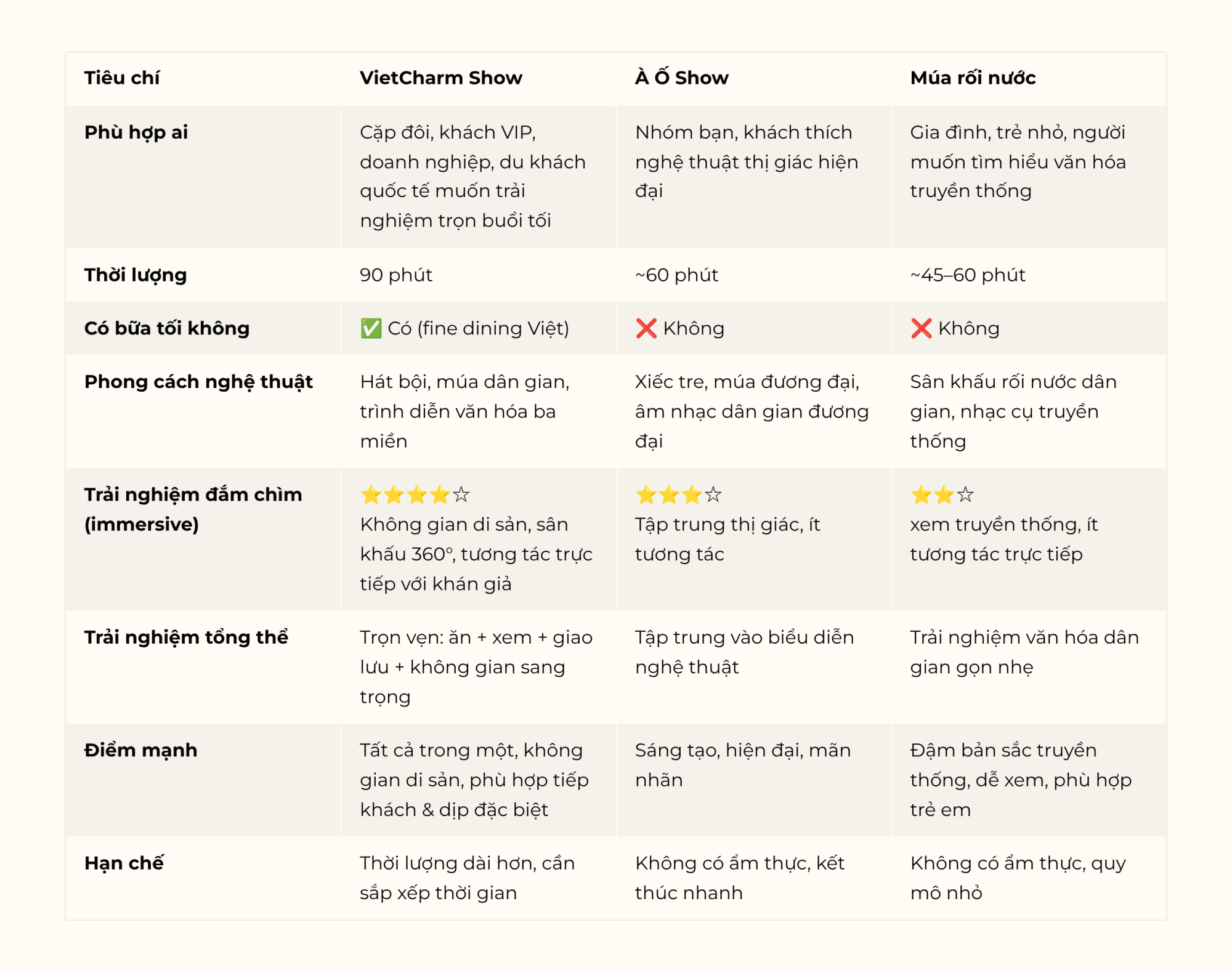 Mỗi loại hình đều mang đến một sắc thái rất riêng. Nếu bạn yêu thích nghệ thuật thị giác hiện đại và muốn thưởng thức một vở diễn sáng tạo trong thời gian ngắn, À Ố Show sẽ là lựa chọn giàu cảm xúc. Nếu muốn khám phá nét văn hóa dân gian truyền thống, gần gũi và phù hợp cho gia đình, múa rối nước mang lại trải nghiệm nhẹ nhàng, dễ tiếp cận.